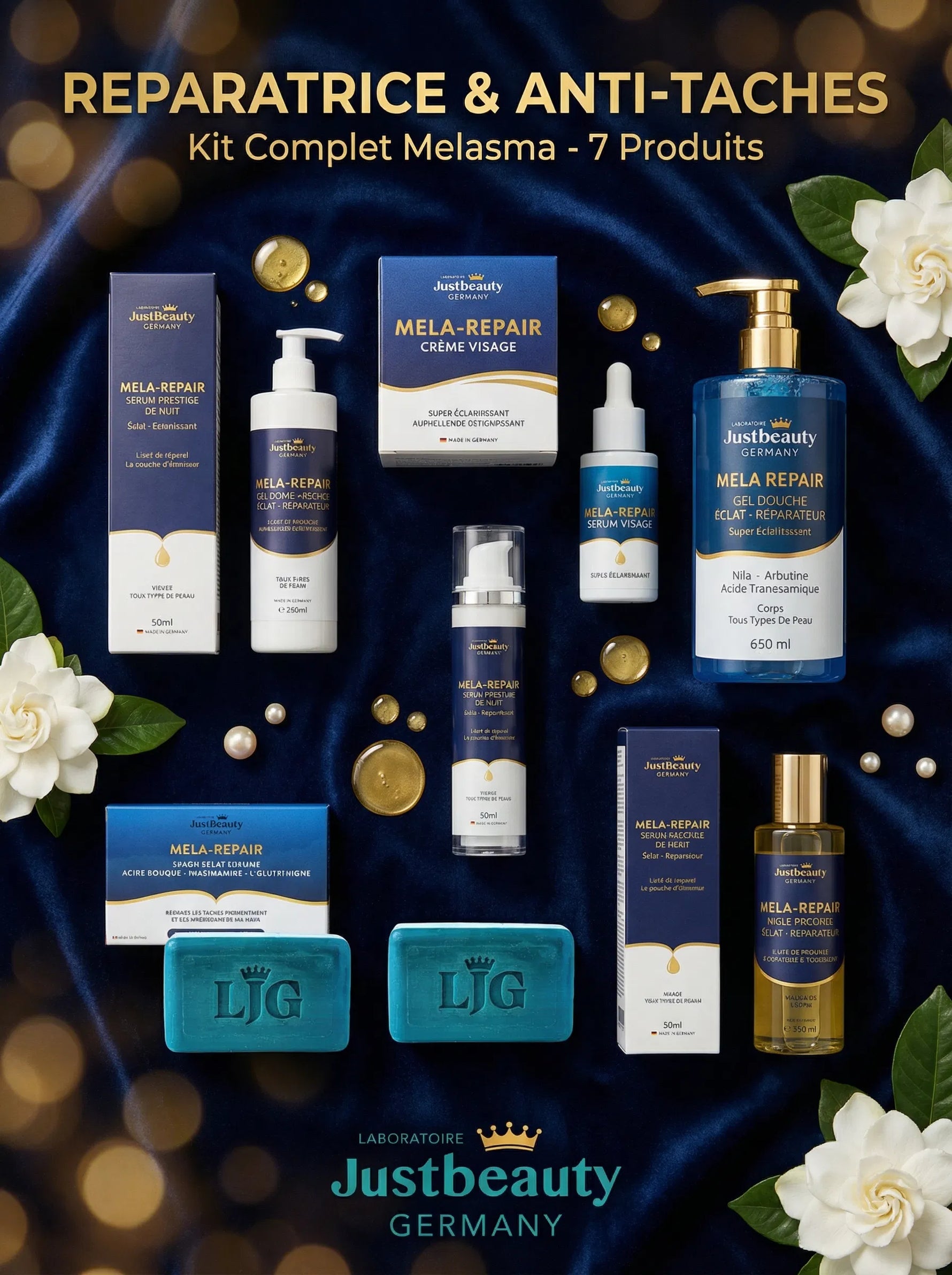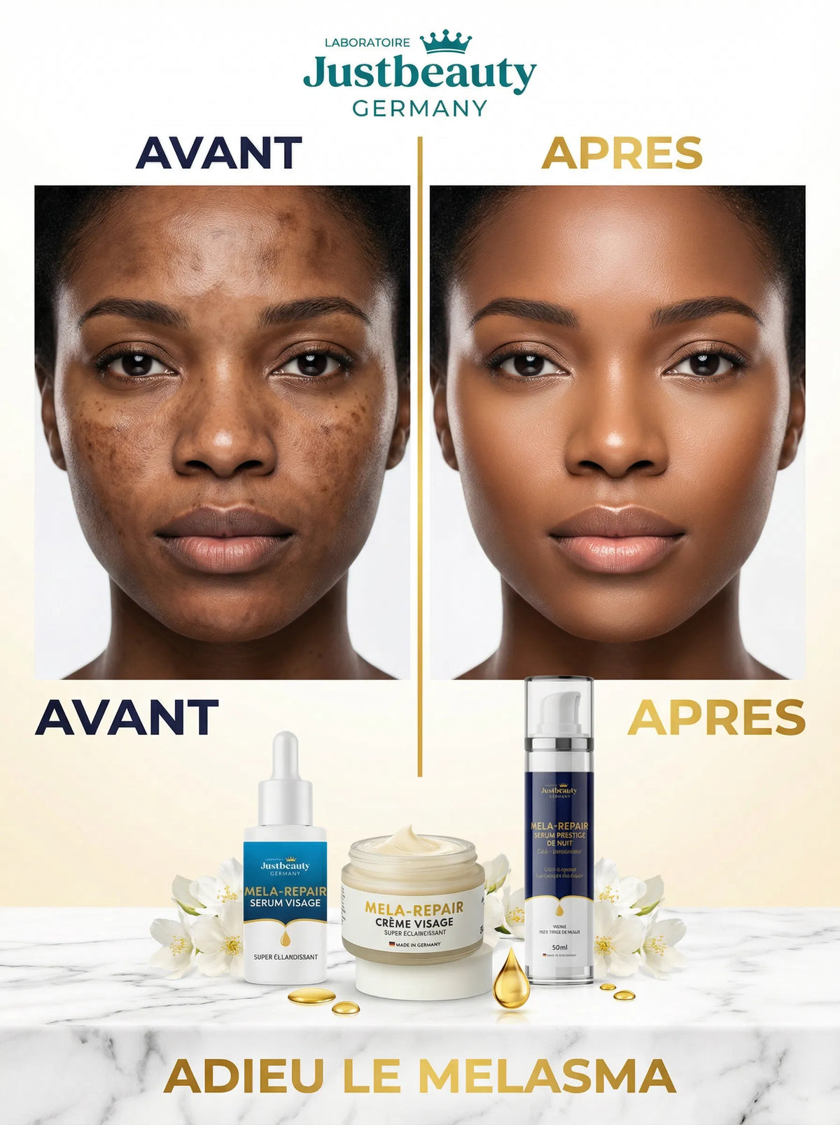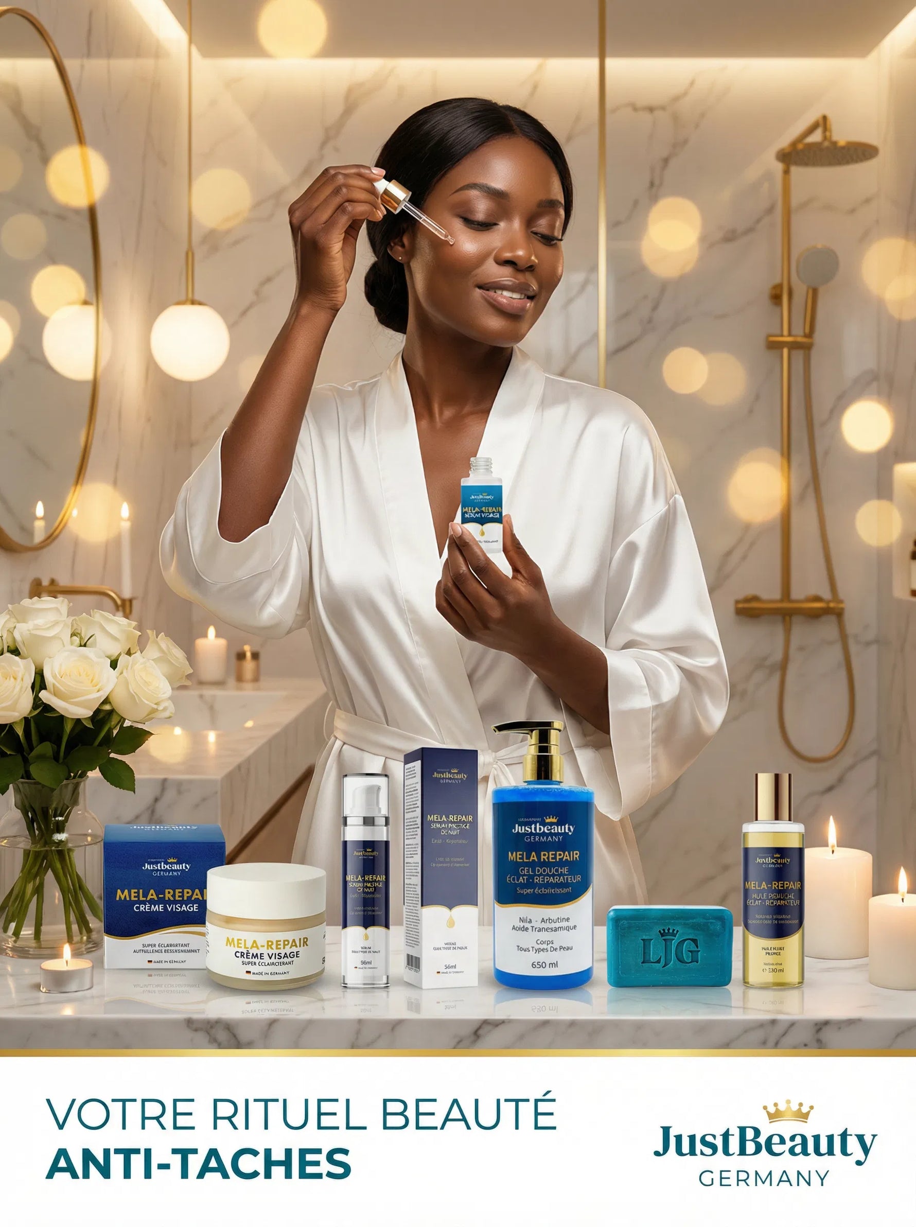 Offrez à votre peau la transformation qu’elle mérite avec MELA REPAIR, le programme professionnel le plus complet jamais développé par le Laboratoire JustBeauty Germany pour corriger les taches, unifier le teint et révéler un éclat incomparable.